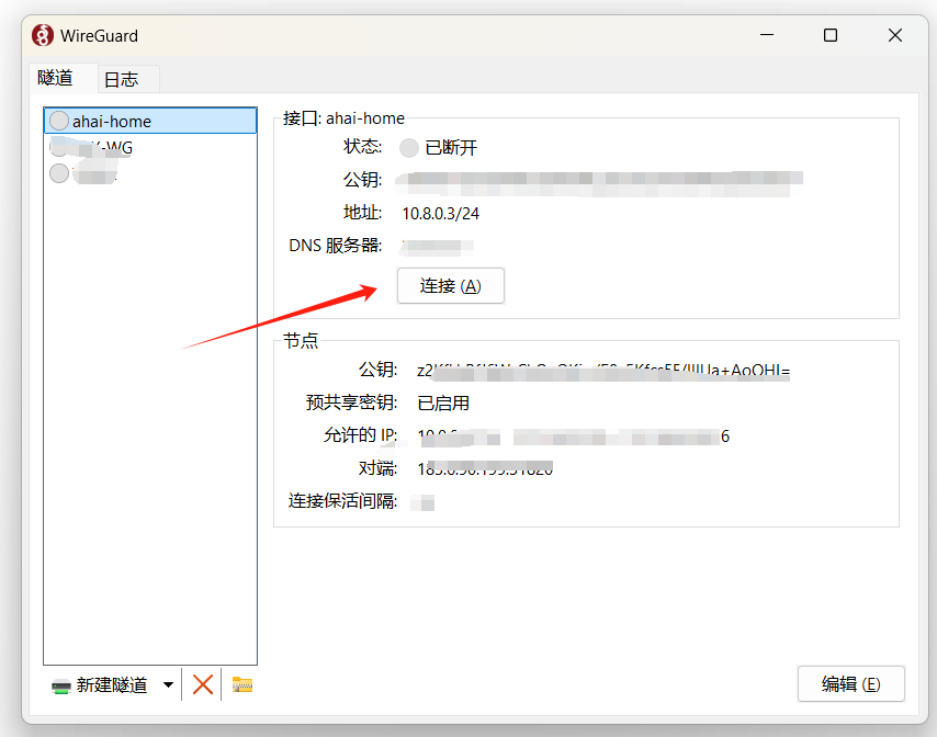 选择“新建隧道”,在选择窗选定运维人员提供的“PC”客户端配置文件,出现下图,点击“连接”即可: